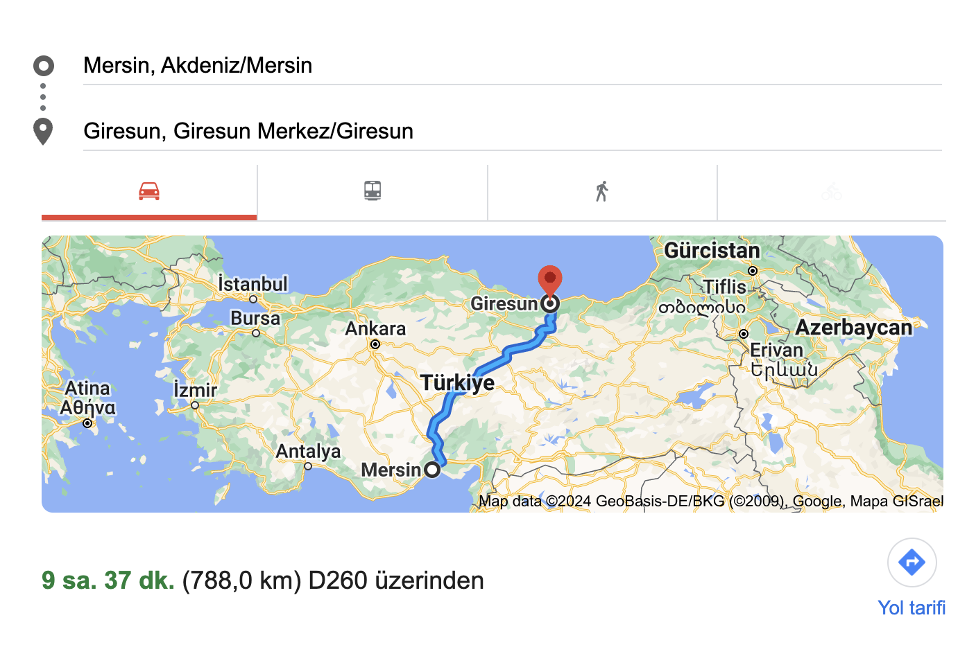 Mersin ve Giresun Arası Mesafe