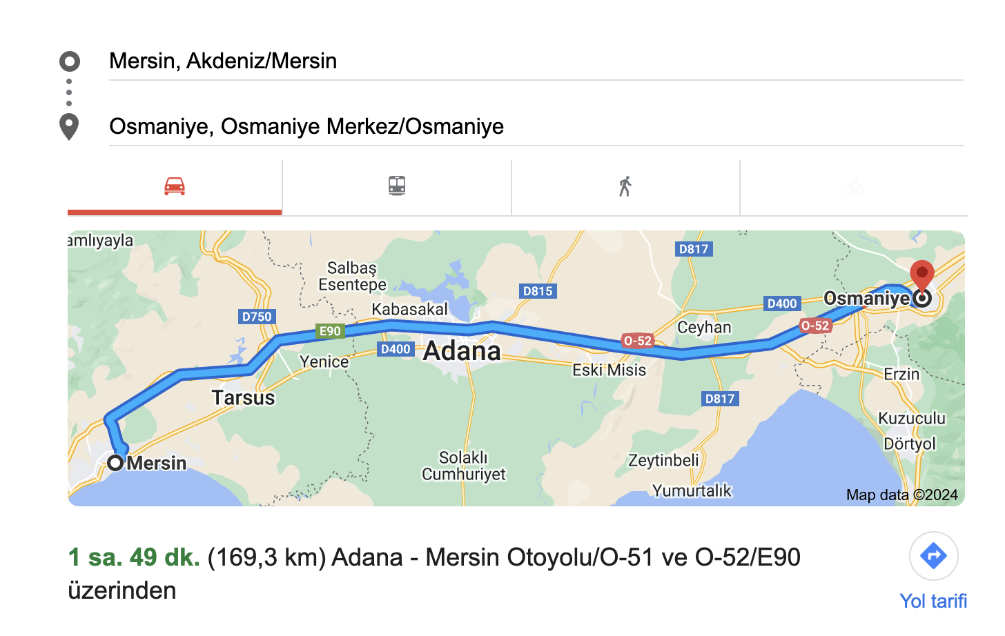 Kara yolu ile Mersin’den Osmaniye’ye seyahat etmek için en yaygın güzergah, Mersin’den Osmaniye’ye doğrudan D400 karayolu üzerinden geçiş yapmaktır. Bu güzergah boyunca mesafe yaklaşık 100 kilometre civarındadır. Kara yolu ile seyahat süresi, yol koşulları, trafik durumu ve hava koşullarına bağlı olarak genellikle 1.5-2 saat arasında değişir. Yolculuk süresi, özellikle yoğun trafik saatlerinde veya kötü hava koşullarında uzayabilir, bu nedenle seyahat öncesinde güncel trafik durumunu kontrol etmek faydalı olabilir.