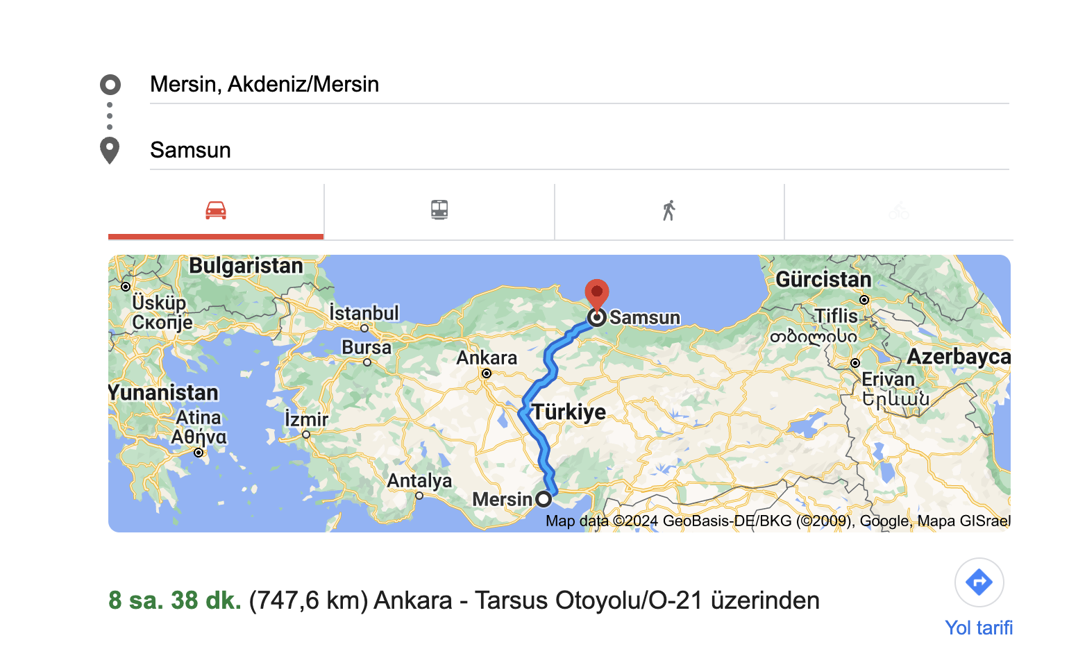 Mersin ile Samsun arasındaki mesafe, kullanılan seyahat yöntemine bağlı olarak değişiklik gösterebilir. Karasal mesafe yaklaşık 650 kilometre iken, kara yolu ile bu mesafe 850-900 kilometre arasında olabilir ve yolculuk süresi genellikle 12-14 saat sürer. Hava yolu ile seyahat, daha kısa mesafe sunar ancak doğrudan uçuşların mevcut olmaması nedeniyle aktarmalı seçenekler tercih edilir. Demiryolu seçeneği ise daha uzun sürebilir ve aktarmalar gerektirir. Seyahat planınızı yaparken, güzergah ve taşıma seçeneğinizi dikkate alarak en uygun rotayı seçmeniz faydalı olacaktır.