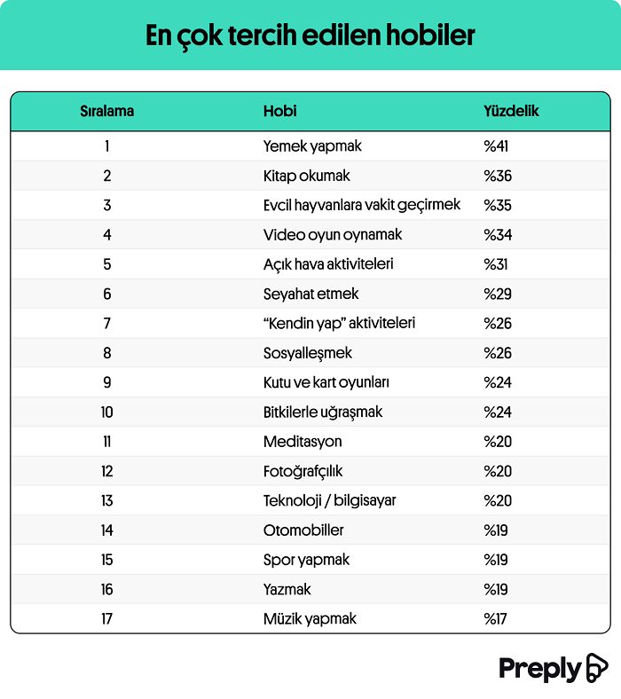 44 binden fazla yabancı dil öğretmenini tek platformda buluşturan ve İngilizce, Almanca, Fransızca, İtalyanca, İspanyolca online özel ders için tek durak olan Preply’nin dil ve kültür odaklı derlemelerinin en yenisi, dünya çapında en çok edinilen hobinin yemek yapmak olduğunu gösterdi. Buna karşın Statista verileri, Türkiye’deki katılımcıların %48’inin alışveriş yapmayı hobilerin ilk sırasına yerleştirdiği; alışveriş hobisini ise teknoloji, bilgisayar, seyahat etmek, okumak ve sosyalleşmek gibi başlıkların izlediğini gösterdi.